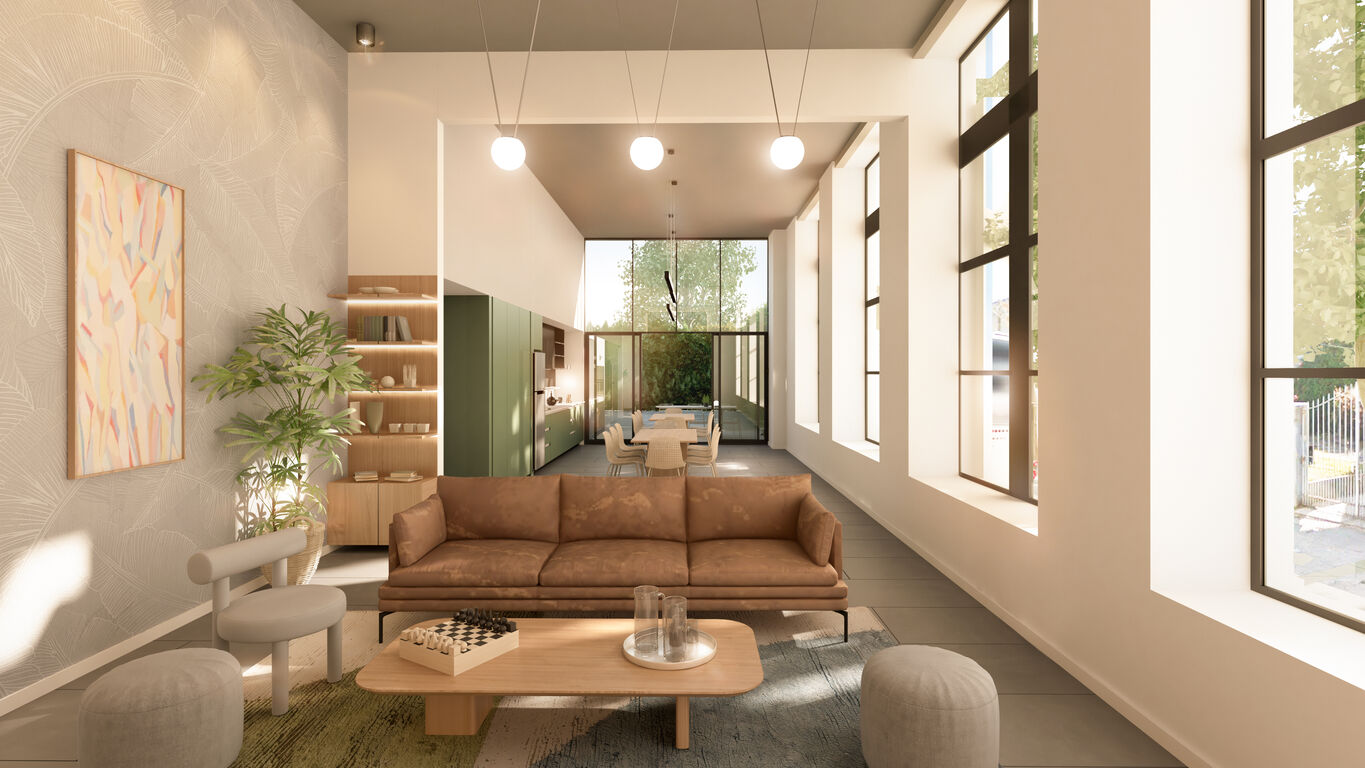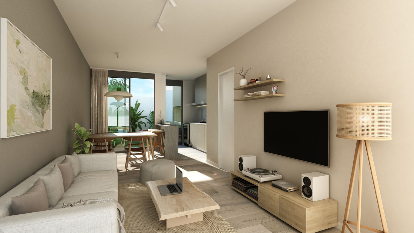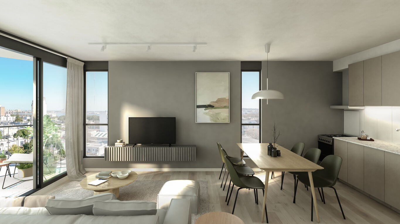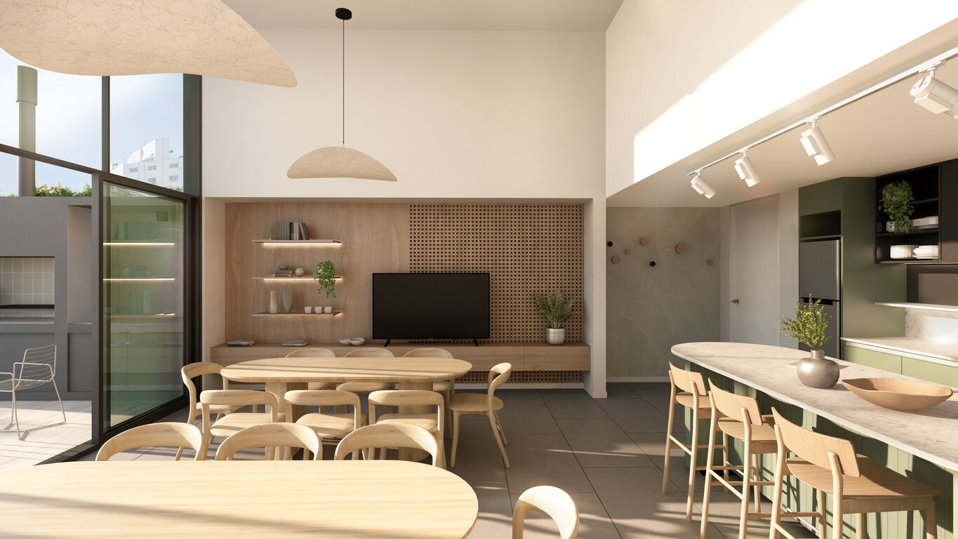 El amplio y funcional living comedor se destaca por su diseño de alta calidad y eficiencia espacial. Cuenta con puerta de acceso con cerradura electrónica, pavimento vinílico símil madera resistente, aberturas de aluminio con cortinas integradas y aire acondicionado split frío-calor. Este espacio invita a disfrutar de momentos en familia y reuniones con amigos, ofreciendo un ambiente cómodo y moderno.